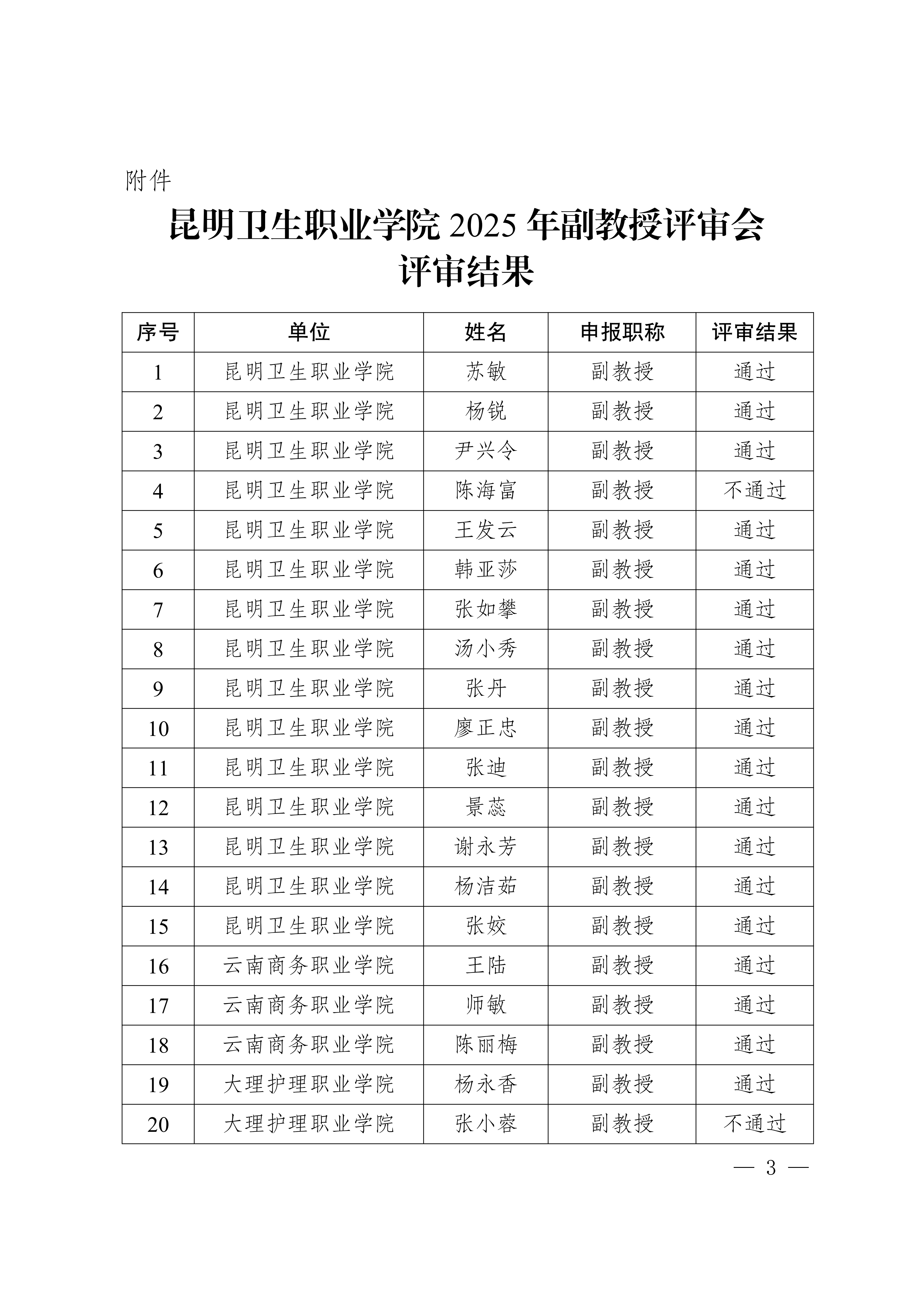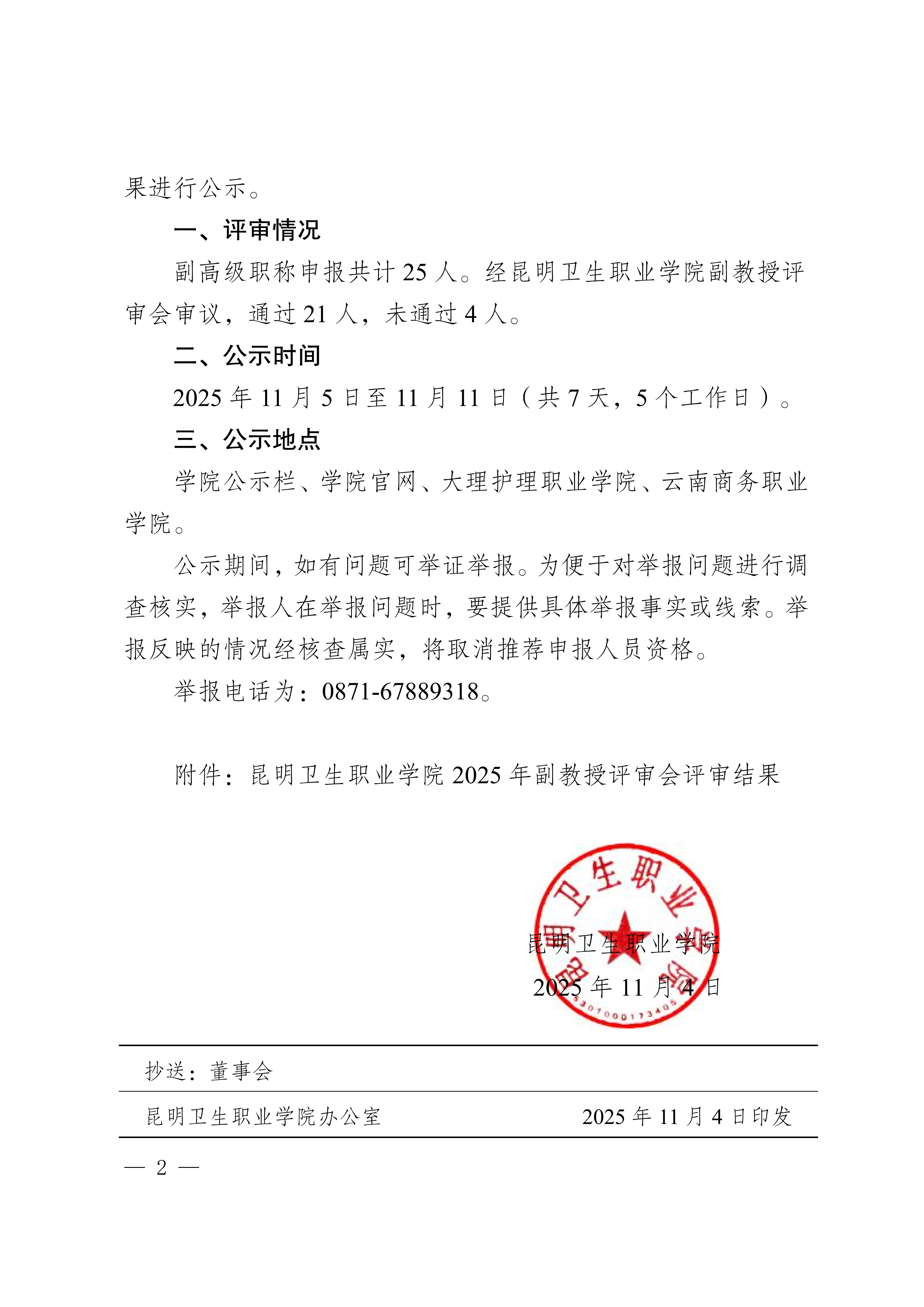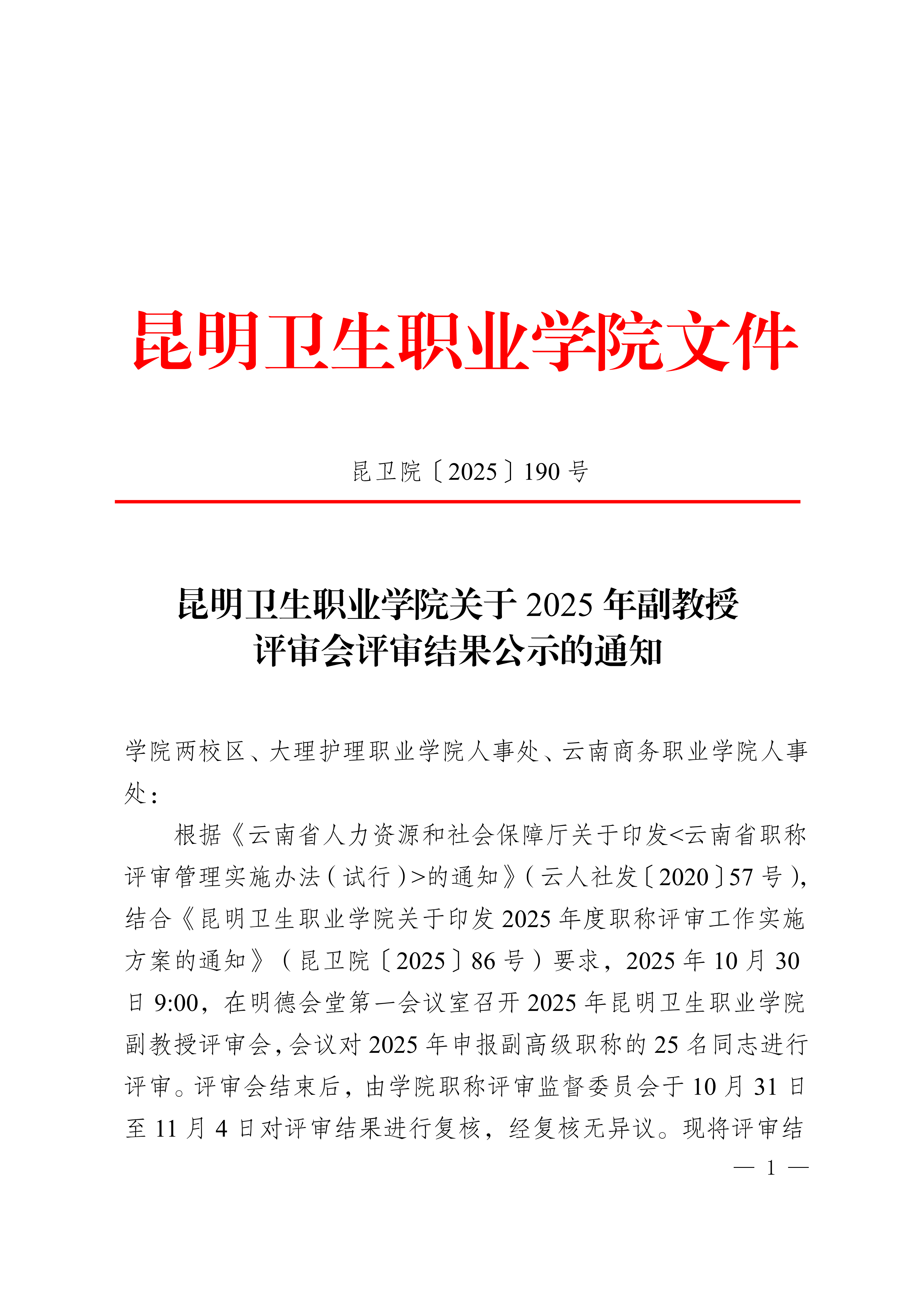 昆卫院〔2025〕190号 昆明卫生职业学院关于2025年副教授评审会评审结果公示的通知