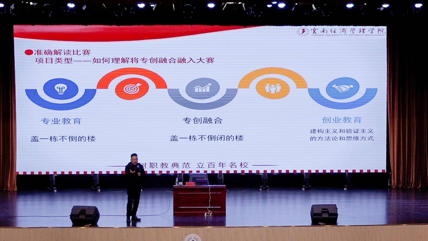 为深入理解中国国际大学生创新大赛(原“互联网+”大赛)精神,准确把握大赛导向,提升学院创新创业教育水平与参赛项目质量,12月16日,特邀云南经济管理学院创新创业学院院长焦艳军教授来校,开展题为“以赛促学,赋能高质量人才培养”的专题讲座。