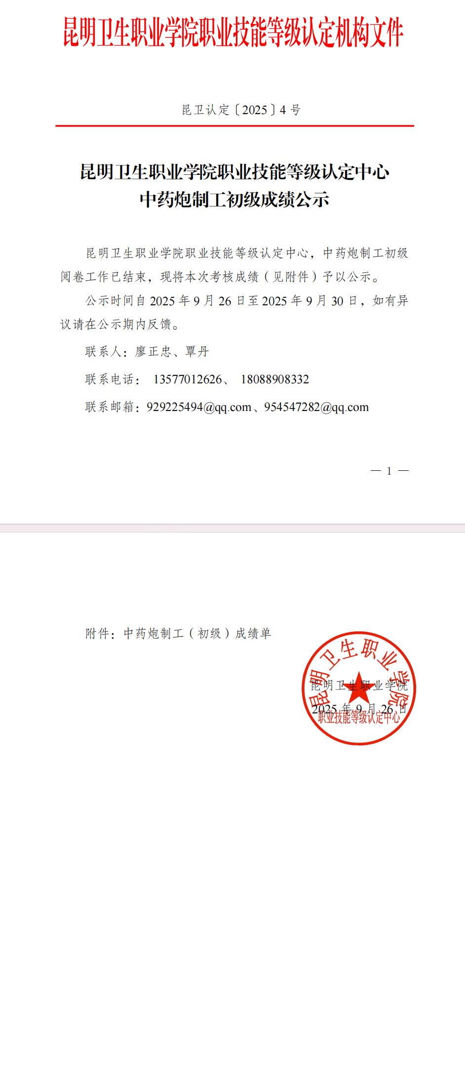 昆卫认定2025-4号文件-中药炮制工初级成绩公示