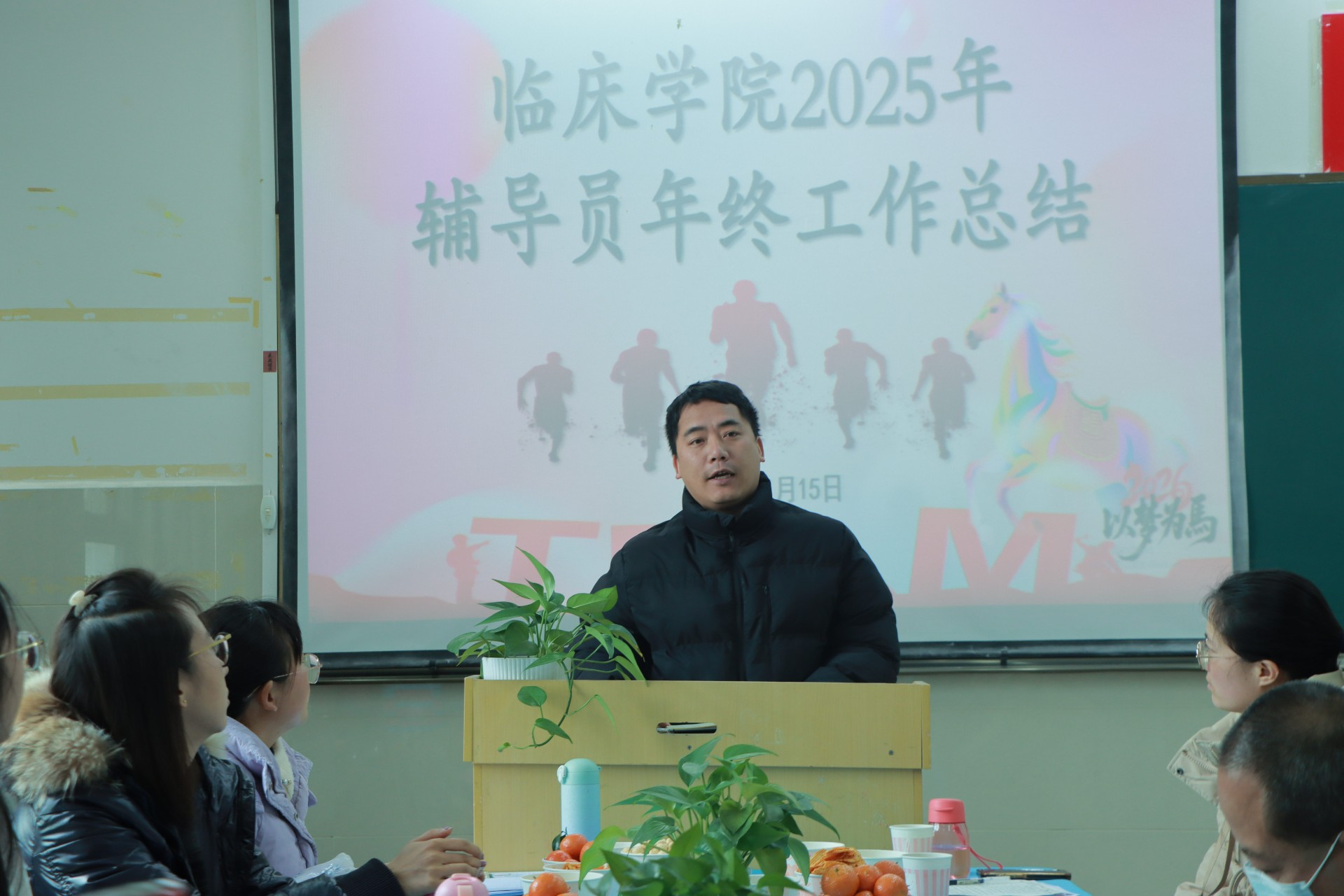 杨登光书记对临床学院2025年学生管理工作取得的成效给予充分肯定。他指出,过去一年,全体辅导员扎根育人一线,在思想引领上精准发力,在学风建设上持续用力,在安全稳定上筑牢防线,在日常管理、毕业生就业服务等重点工作中展现出高效执行力,为培养高素质医学人才提供了坚实保障。他强调,年终总结是全面复盘工作的契机,既要总结成绩亮点,也要找准短板不足。学生工作点多面广、责任重大,全体辅导员要以“时时放心不下”的责任感抓实抓细各项工作,突出重点、扭住关键,注重实干、务求实效,切实做到守土有责,全力确保校园和谐稳定。