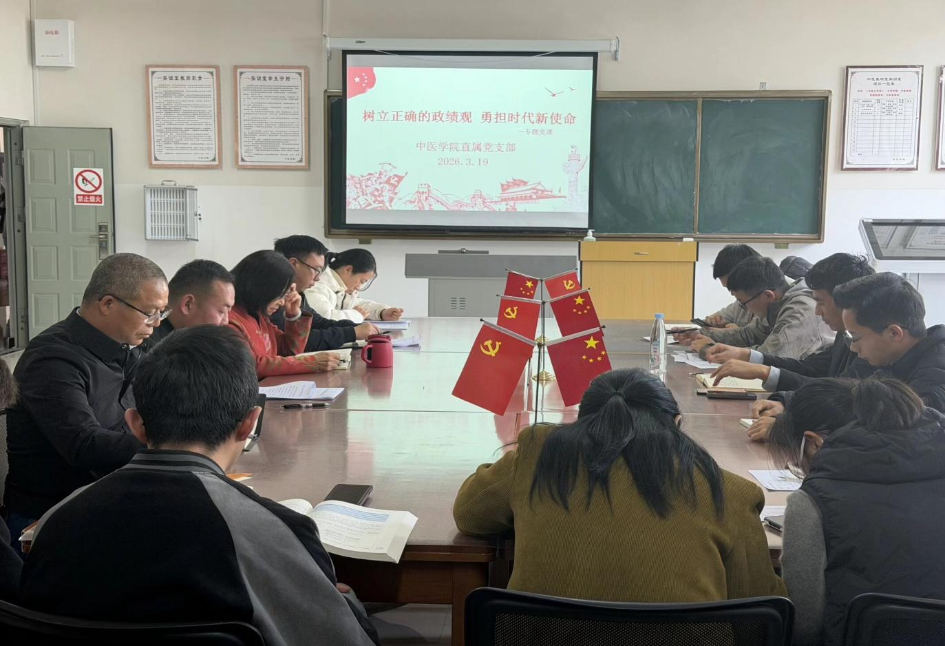 为贯彻落实《中共昆明卫生职业学院委员会关于开展树立和践行正确政绩观学习教育》的实施方案,持续加强党员干部思想政治建设,引导全体党员坚定理想信念、强化责任担当,中医学院直属党支部于3月19日在中医学院204组织开展“树立正确政绩观 勇担时代新使命”专题党课。本次党课由党支部书记易斯坐主持,党支部全体党员、干部参加学习。