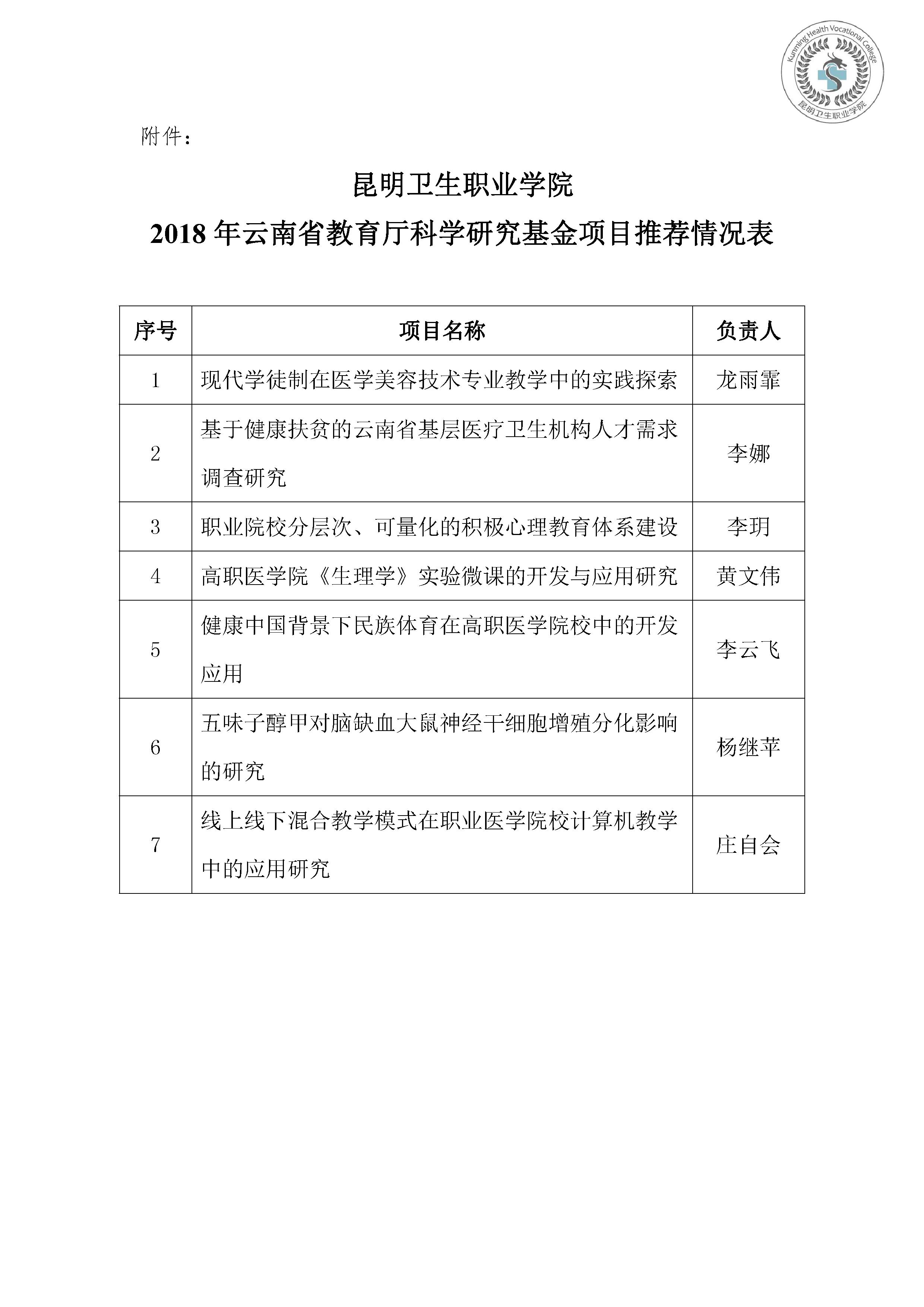 昆明卫生职业学院关于2018年度云南省教 育厅科学研究基金项目评审结果的公示