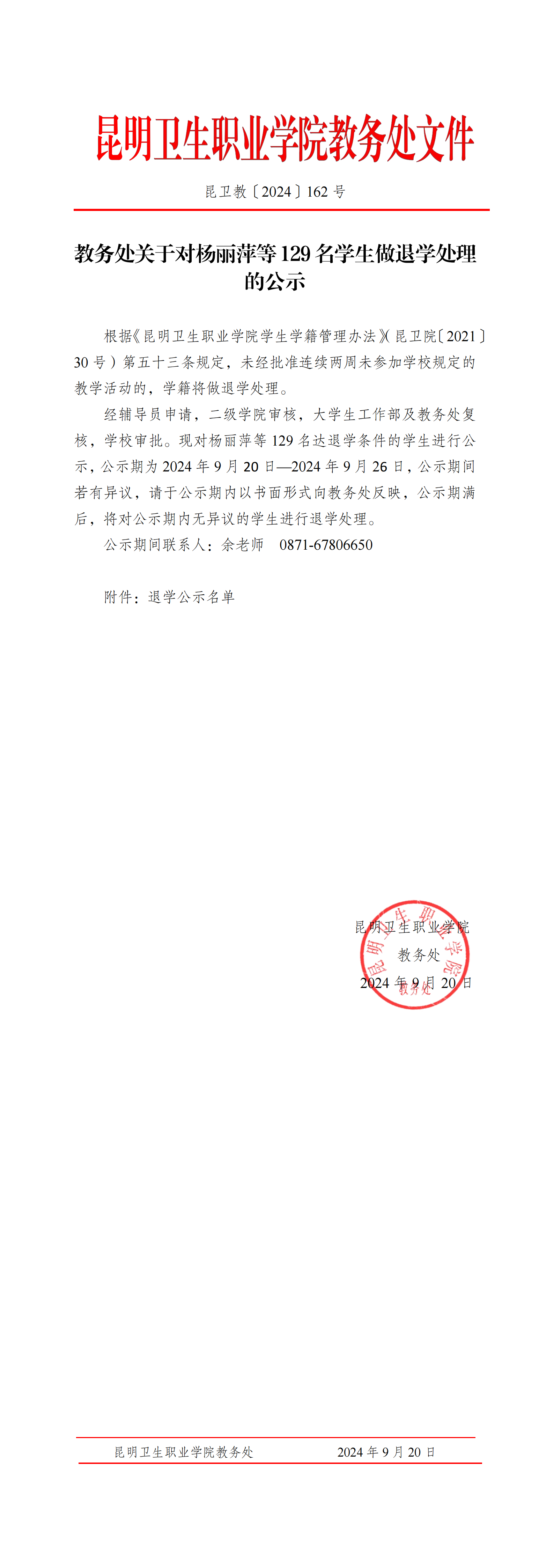 教务处关于对杨丽萍等129名学生做退学处理的公示