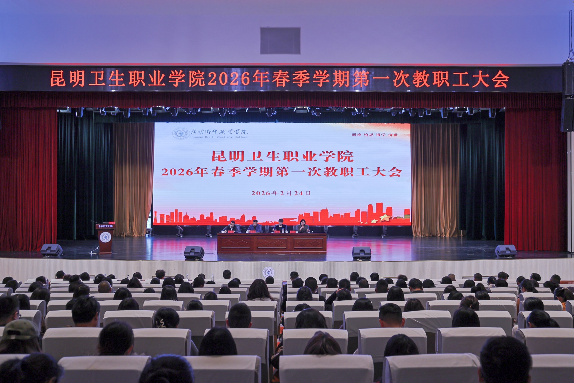 2月24日下午,我校在明德会堂召开2026年春季学期第一次教职工大会,全面部署新学期工作任务。云南泓旻教育投资管理集团董事长、昆明卫生职业学院理事长龙正昌,党委副书记、校长龙雨霏,副校长李玉晶、陈举国、张磊及全体教职员工参会。