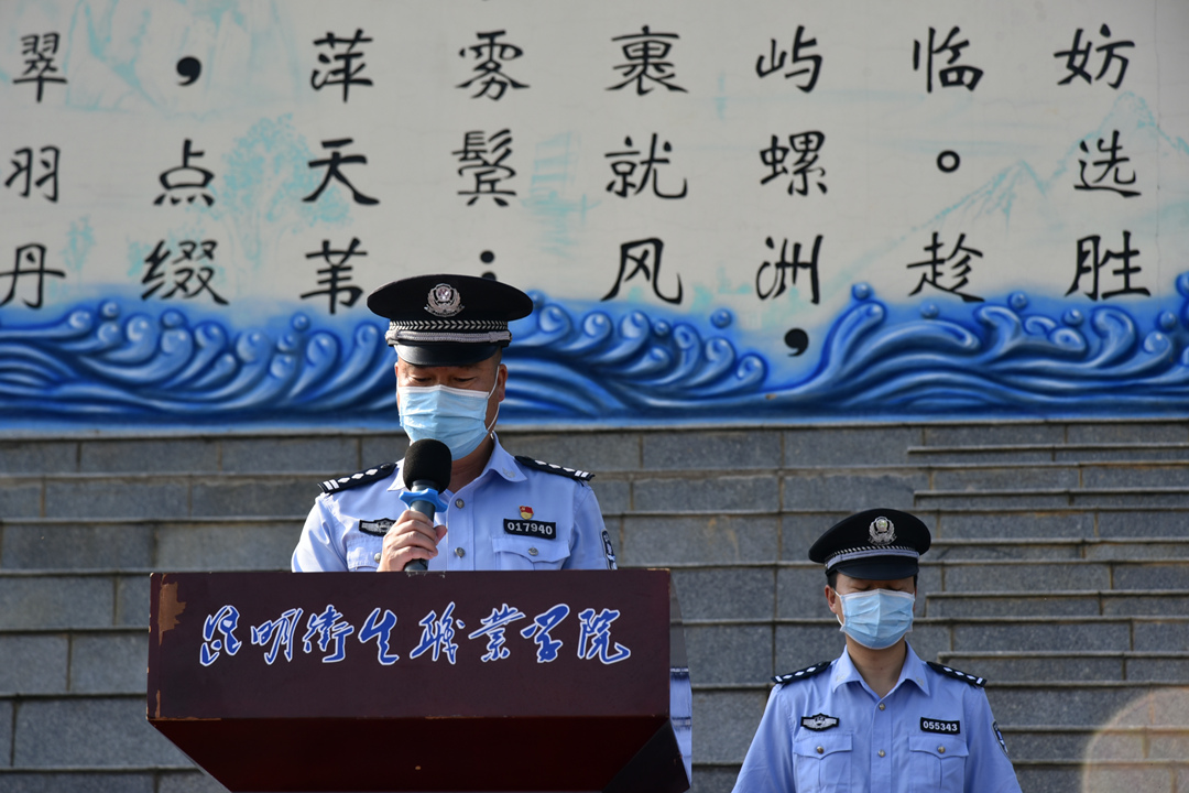 昆明市公安局党委委员、指挥中心主任李文吉为昆明卫生职业学院志愿者服务队授队旗。