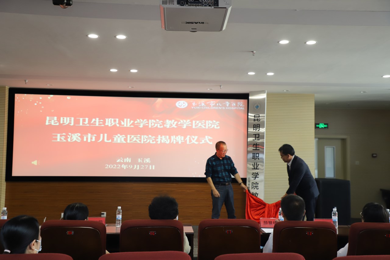 9月27日,昆明卫生职业学院与玉溪市儿童医院举行了教学医院揭牌仪式。玉溪市儿童医院党委书记杨丽萍,玉溪市儿童医院党委副书记、执行院长李超,玉溪市儿童医院党委副书记陈荣,玉溪市儿童医院副院长杨晓云、陈文娟、杨杰,昆明卫生职业学院副院长张尤松,护理学院院长蒋淑昆,检验学院院长张群智,实习管理处副处长颜慧林,实习管理科黄如楷老师,以及医院各教研室(组)主任、秘书,实习生出席了揭牌仪式。