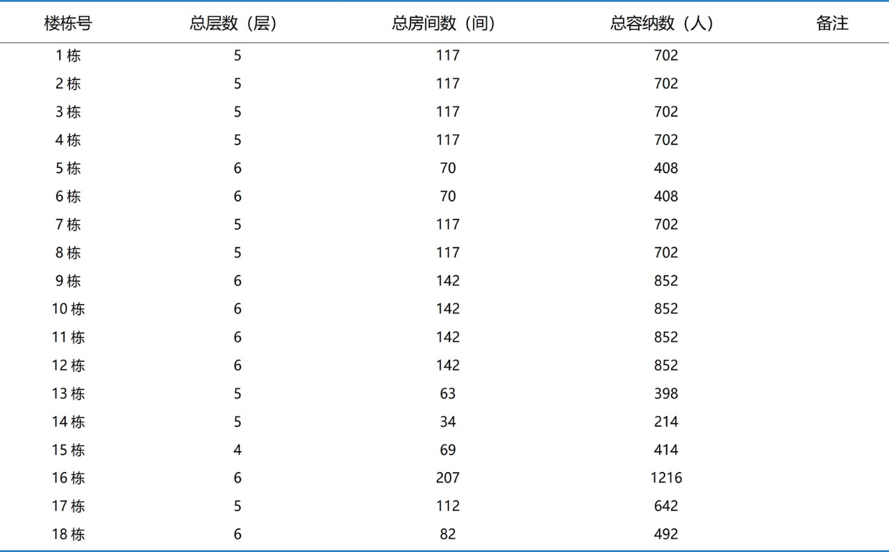 2017年至2018年,我校学生公寓有1-18栋,总计18栋学生公寓,覆盖我校1期和2期两个片区,总容纳量为11812生。具体如下: