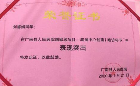 我校2015级五年制护理4班学生刘睿娴,在广南县人民医院实习期间,积极参与科室的胸痛业务培训,在医院胸痛中心接受专家组暗访期间,为医院胸痛中心暗访环节赢得了专家较高的评价。为此,经医院办公会研究决定,对我校刘睿娴同学特别予以全院通报表扬。2019年11月11日——2019年12月...