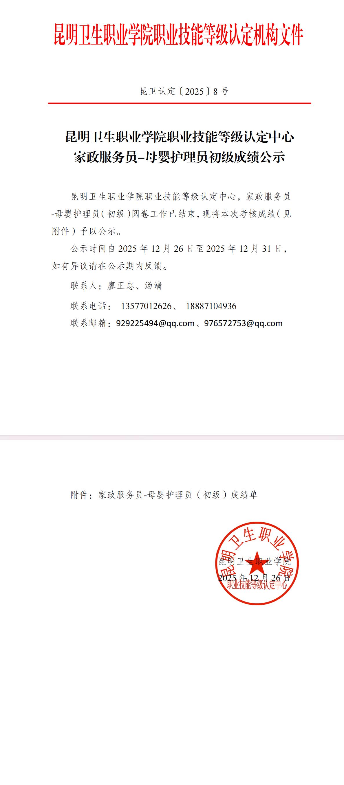 昆卫认定〔2025〕8号-家政服务员-母婴护理员成绩公示