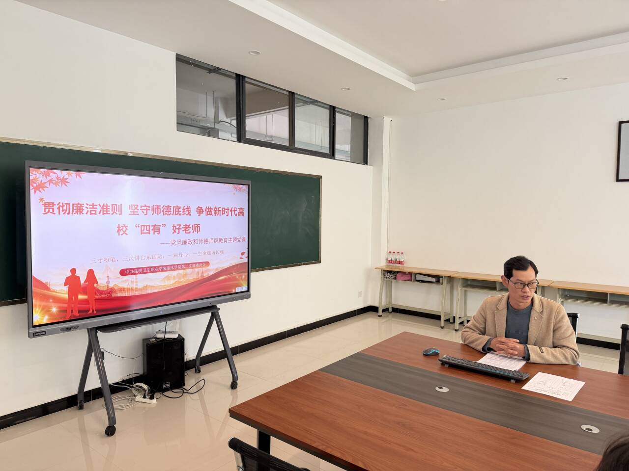 党课伊始,党支部书记杨林杰带领教师深学细悟《中国共产党廉洁自律准则》《新时代高校教师职业行为十项准则》,明确党员教师的道德高线与职业行为底线,要求大家将准则要求内化于心、外化于行,明底线、知敬畏、守初心。通过结合教育领域典型案例的警示教育环节,从学术不端、徇私舞弊、言行失范等方面敲响警钟。结合专业关乎生命健康的职业特性,强调廉洁之心是育人之基,师德底线是立身之本,教师品行直接影响学生三观塑造。
