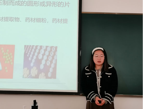 车水秀老师给大家展示了《药剂学》第六章片剂第一节概述的内容,车老师主要讲授了片剂的概念和片剂的分类。随后,教研室各位老师分享了自己的授课经验。杨艳老师建议“在导课时以案例的形式导入课堂,与学生产生共鸣,激发学生学习的兴趣。李春逵、赵祥月、高华春老师建议授课过程中加入可操作的小实验,如“泡腾片的溶解过程”,将艰涩的理论知识通过简单明了的实验进行展示。